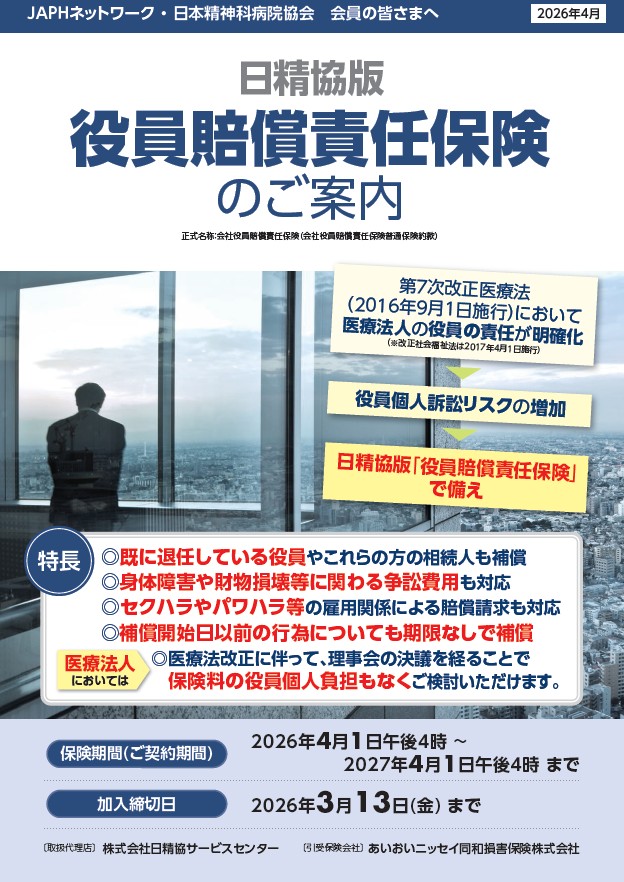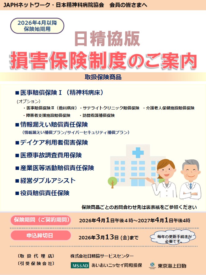 - 医事賠償保険(サテライトクリニック賠償保険/介護老人保健施設賠償保険/障害者支援施設賠償保険/訪問看護補償保険)