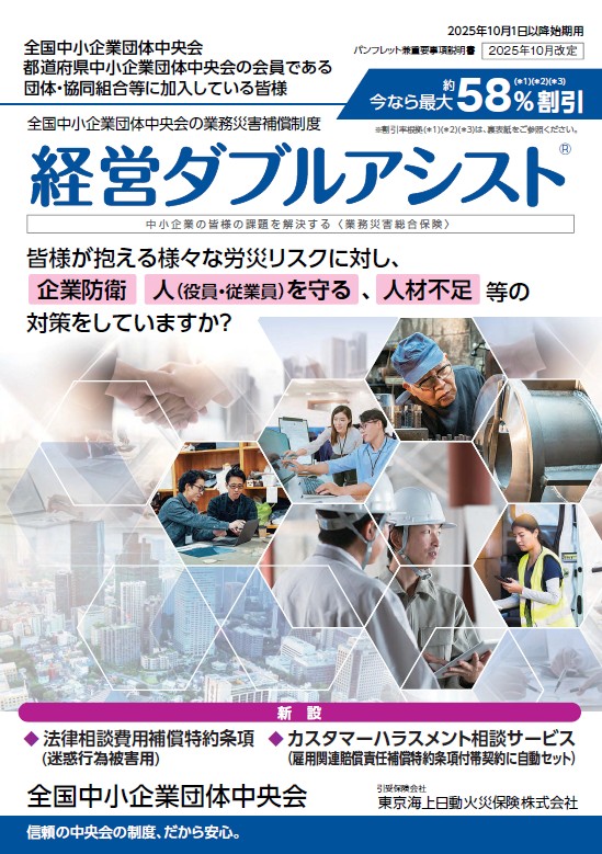 医療法人の経営者・従業員双方の業務災害リスクに対応する補償につきまして、全国中小企業団体中央会のスケールメリットを活かした低廉な保険料でご加入いただける制度です。